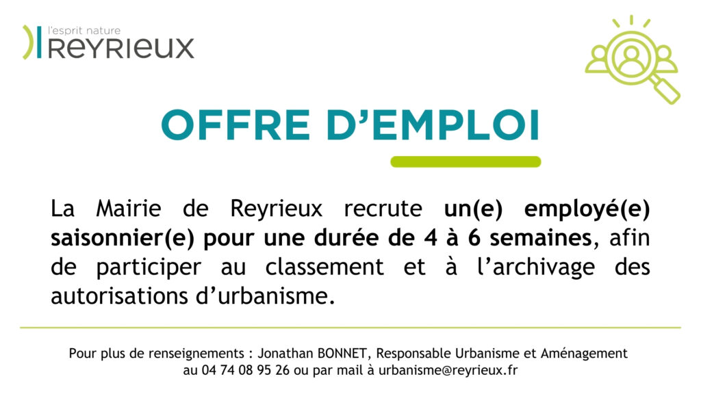 La commune de Reyrieux recrute un(e) employé(e) saisonnier(e) pour une durée de 4 à 6 semaines, afin de participer au classement et à l’archivage des autorisations d’urbanisme.