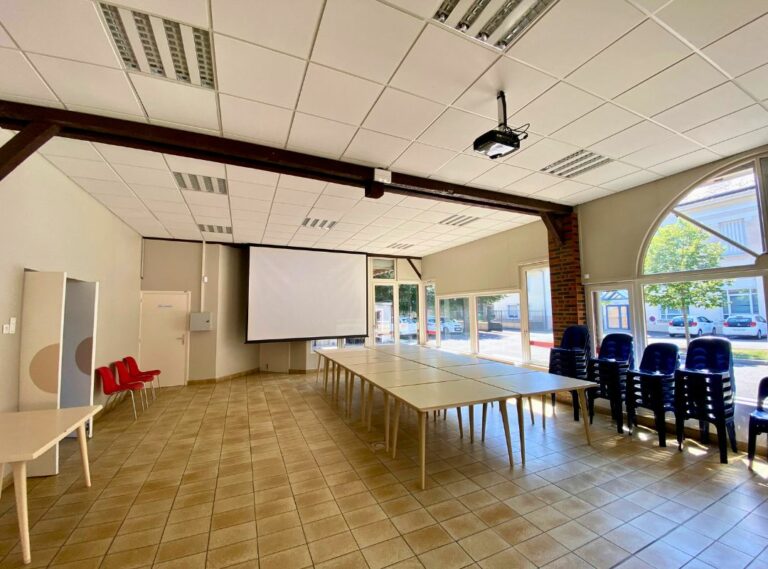 Grande salle avec tables, chaises, écran et vidéoprojecteur